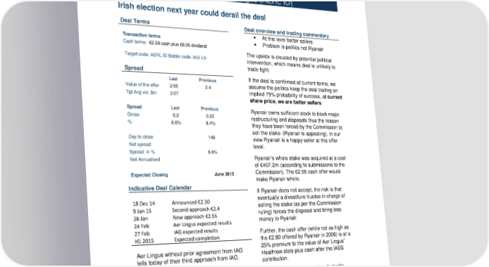 Makor Securities Merger Arbitrage and Special Situations Event-Driven and Merger Arbitrage Research Europe Event-Driven and Merger Arbitrage Sales Europe Alex Olvera aolvera@makorsecurities.com +44 207 290 5772 1 | P a g e 26 January 2015 Quick Report: IAG (IAG LN) approach for Aer Lingus (AERL ID) Irish election next year could derail the deal Deal Terms Transaction terms Cash terms: €2.50 cash plus €0.05 dividend Target code: AERL ID Bidder code: IAG LN Spread Last Previous Value of the offer 2.55 2.4 Tgt Avg vol. $m 2.07 Spread Last Previous Gross 0.2 0.23 % 6.6% 8.4% Day to close 148 Net spread Spread in % 6.6% Net Annualised Expected Closing June 2015 Indicative Deal Calendar 18 Dec 14 Announced €2.30 9 Jan 15 Second approach €2.4 26 Jan New approach €2.55 24 Feb Aer Lingus expected results 27 Feb IAG expected results H1 2015 Expected completion Aer Lingus without prior agreement from IAG tells today of their third approach from IAG. The potential offer said IAG is €2.50 in cash and a dividend of €0.05. Preconditions to include confirmatory due diligence, the recommendation of the Board of Aer Lingus and the receipt of irrevocable commitments from Ryanair and the Minister for Finance of Ireland to accept the offer. Deal overview and trading commentary At this level better sellers Problem is politics not Ryanair The upside is clouded by potential political intervention, which means deal is unlikely to trade tight. If the deal is confirmed at current terms, we assume the politics keep the deal trading on implied 75% probability of success, a t current share price, we are better sellers Ryanair owns sufficient stock to block major restructuring and disposals thus the reason they have been forced by the Commission to sell the stake. (Ryanair is appealing). In our view Ryanair is a happy seller at this offer level. Ryanair’s whole stake was acquired at a cost of €407.2m (according to submissions to the Commission). The €2.55 cash offer would make Ryanair whole. If Ryanair does not accept, the risk is that eventually a divestiture trustee in charge of selling the stake (as per the Commission ruling) forces the disposal and bring less money to Ryanair. Further, the cash offer (while not as high as the €2.80 offered by Ryanair in 2006) is at a 25% premium to the value of Aer Lingus’ Heathrow slots plus cash after the IASS contribution. The problem could be politics. Ireland’s general election is next year. Already Fianna Fáil is calling the stake “strategic national interest” and wants a rejection of the deal. Unions may intervene as 1000 jobs could be lost says FF. Aer Lingus has been widely expected to merge. Without IAG, any stock bid premium could dissipate.