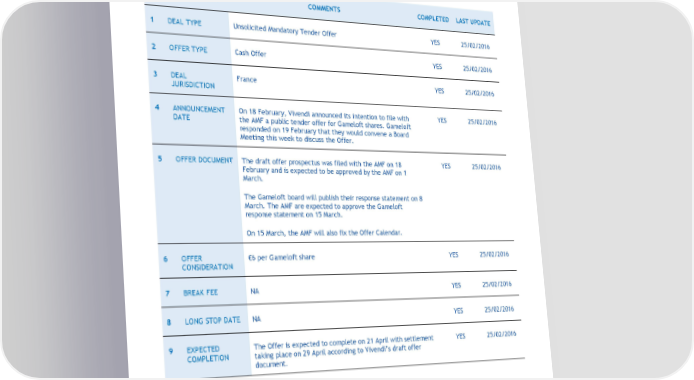 MERGER ARBITRAGE 25 February 2016 The Makor Checklist® I. DEAL DATA DESCRIPTION COMMENTS COMPLETED LAST UPDATE 1 DEAL TYPE Unsolicited Mandatory Tender Offer YES 25/02/2016 2 OFFER TYPE Cash Offer YES 25/02/2016 3 DEAL France YES 25/02/2016 JURISDICTION 4 ANNOUNCEMENT On 18 February, Vivendi announced its intention to file with YES 25/02/2016 DATE the AMF a public tender offer for Gameloft shares. Gameloft responded on 19 February that they would convene a Board Meeting this week to discuss the Offer. 5 OFFER DOCUMENT The draft offer prospectus was filed with the AMF on 18 YES 25/02/2016 February and is expected to be approved by the AMF on 1 March. The Gameloft board will publish their response statement on 8 March. The AMF are expected to approve the Gameloft response statement on 15 March. On 15 March, the AMF will also fix the Offer Calendar. 6 OFFER €6 per Gameloft share YES 25/02/2016 CONSIDERATION 7 BREAK FEE NA YES 25/02/2016 8 LONG STOP DATE NA YES 25/02/2016 9 EXPECTED The Offer is expected to complete on 21 April with settlement YES 25/02/2016 COMPLETION taking place on 29 April according to Vivendi’s draft offer document. 9 | P a g e
