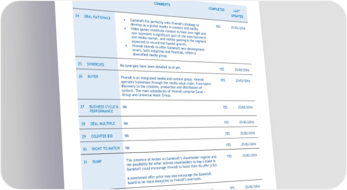 MERGER ARBITRAGE 25 February 2016 IV. DEAL RATIONALE,VALUATION, COUNTER BID RISK AND POST MERGER ECONOMICS DESCRIPTION COMMENTS COMPLETED LAST UPDATED 24 DEAL RATIONALE Gameloft fits perfectly with Vivendi’s strategy to YES 25/02/2016 develop as a global leader in content and media. Video games constitute content in their own right and now represent a significant part of the entertainment and media market, and mobile gaming is the segment expected to record the fastest growth. Vivendi intends to offer Gameloft new development levers, both industrial and financial, within a diversified media group. 25 SYNERGIES No synergies have been detailed as of yet. YES 25/02/2016 26 BUYER Vivendi is an integrated media and content group. Vivendi YES 25/02/2016 operates businesses through the media value chain, from talent discovery to the creation, production and distribution of content. The main subsidiaries of Vivendi comprise Canal + Group and Universal Music Group. 27 BUSINESS CYCLE & NA YES 25/02/2016 PERFORMANCE 28 DEAL MULTIPLE NA YES 25/02/2016 29 COUNTER BID NA YES 25/02/2016 30 RIGHT TO MATCH NA YES 25/02/2016 31 BUMP The presence of Amber on Gameloft’s shareholder register and YES 25/02/2016 the possibility for other activist shareholders to buy a stake in Gameloft could encourage Vivendi to boost their €6 offer price. A sweetened offer price may also encourage the Gameloft board to be more receptive to Vivendi’s overtures. 32 OPTIONALITY Possibility of a bump from Vivendi to secure board support YES 25/02/2016 from Gameloft’s board. There is the risk that Vivendi do nothing and not increase the price. 33 READ ACROSS NA YES 25/02/2016 34 CONSOLIDATION NA YES 25/02/2016 12 | P a g e