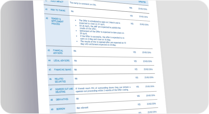 MERGER ARBITRAGE 25 February 2016 VI. TECHNICALS DESCRIPTION COMMENTS COMPLETED LAST UPDATED 40 INDEX IMPACT Too early to comment on this. YES 25/02/2016 41 RISK TO TIMING NA YES 25/02/2016 42 TENDER & The Offer is scheduled to open on 3 March and is YES 25/02/2016 SETTLEMENT expected to close on 21 April. PROCESS On 26 April, the AMF are expected to publish the results of the offer. Settlement of the Offer is expected to take place on 29 April. If the Offer is successful, the offer is expected to re- open on 2 May and close on 16 May. The results of the re-opened offer are expected on 19 May with settlement expected on 24 May. 43 FINANCIAL NA YES 25/02/2016 ADVISORS 44 LEGAL ADVISORS NA YES 25/02/2016 45 FINANCING BANKS NA YES 25/02/2016 46 RELATED NA YES 25/02/2016 SECURITIES 47 SQUEEZE OUT AND If Vivendi reach 95% of outstanding shares they can initiate a YES 25/02/2016 DELISTING squeeze-out proceeding within 3 months of the Offer closing. 48 DERIVATIVES NA YES 25/02/2016 49 BORROW Not relevant YES 25/02/2016 50 PRORATION AND Not relevant YES 25/02/2016 ELECTION 15 | P a g e