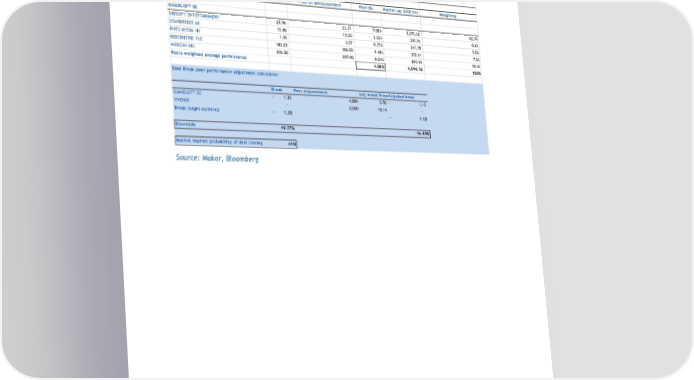 MERGER ARBITRAGE 25 February 2016 DOWNSIDE & BREAK ANALYSIS DOWNSIDE AND BREAK ANALYSIS Deal Break analysis and Market implied probability Selected Peer Group Analysis Last Price Price on announcement Perf (%) Market cap (USD bn) Weighting GAMELOFT SE UBISOFT ENTERTAINMENT 2 4.96 2 3.31 7.08% 3 ,070.62 62.7% STARBREEZE AB 1 5.40 1 5.20 1.32% 3 05.56 6.2% RNTS MEDIA NV 1 .95 2 .07 -5.71% 2 45.58 5.0% REDCENTRIC PLC 1 83.25 1 86.00 -1.48% 3 72.41 7.6% WEBZEN INC 2 06.50 2 07.00 -0.24% 8 99.99 18.4% Peers weighted average performance 4.08% 4,894.16 100% Deal Break peer performance adjustment calculation Break Peer Adjustement Adj. break PriceAdjusted break GAMELOFT SE - 1.35 4.08% 5.70 - 1.13 VIVENDI - 0.00% 1 8.14 - Break target currency - 1.35 - 1.13 Downside -19.77% -16.49% Market Implied probability of deal closing n/m Source: Makor, Bloomberg 16 | P a g e