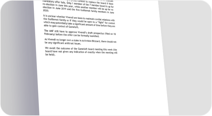 MERGER ARBITRAGE 25 February 2016 Should the Gameloft board reject the Vivendi offer (which we believe they are likely to), there are numerous takeover defences available to them in order to ward off an unwanted offer including a poison pill defence which would dilute Vivendi’s existing stake. Vivendi could also request a board seat or two, as they did in Telecom Italia without launching a proxy contest to replace the board if their mandatory offer fails. Only 1 member of the 7 member board is up for re-election in June this year, while another member will be up for re- election in June 2019 and the five Guillemot family members in June 2020. It is unclear whether Vivendi are keen to maintain cordial relations with the Guillemot family or if they would be open to a “fight” for control which may potentially take a significant amount of time before they are able to gain control of Gameloft. The AMF still have to approve Vivendi’s draft prospectus (filed on 18 February) before the offer can be formally launched. As Vivendi no longer own a stake in Activision Blizzard, there should not be any significant antitrust issues. We await the outcome of the Gameloft board meeting this week (the board have not given any indication of exactly when the meeting will be held). 2 | P a g e