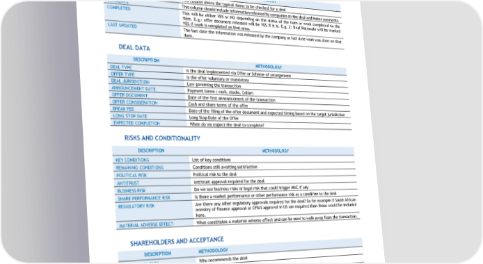 MERGER ARBITRAGE 25 February 2016 Appendix 1: Check List Methodology HEADER DESCRIPTIONS DESCRIPTION METHODOLOGY DESCRIPTION This column shows the typical items to be checked for a deal COMMENTS This column should include information released by companies on the deal and Makor comments. COMPLETED This will be either YES or NO depending on the status of the item or work completed on the item. E.g.: offer document released will be YES if it is. E.g. 2: Deal Rationale will be marked YES if work is completed on that area. LAST UPDATED The last date the information was released by the company or last date work was done on that item. DEAL DATA DESCRIPTION METHODOLOGY DEAL TYPE Is the deal implemented via Offer or Scheme of arrangement OFFER TYPE Is the offer voluntary or mandatory DEAL JURISDICTION Law governing the transaction ANNOUNCEMENT DATE Payment terms ( cash, stocks, Collar) OFFER DOCUMENT Date of the first announcement of the transaction OFFER CONSIDERATION Cash and share terms of the offer BREAK FEE Date of the filing of the offer document and expected timing based on the target jurisdiction LONG STOP DATE Long Stop Date of the Offer EXPECTED COMPLETION When do we expect the deal to complete? RISKS AND CONDITIONALITY DESCRIPTION METHODOLOGY KEY CONDITIONS List of key conditions REMAINING CONDITIONS Conditions still awaiting satisfaction POLITICAL RISK Political risk to the deal ANTITRUST Antitrust approval required for the deal BUSINESS RISK Do we see business risks or legal risk that could trigger MAC if any SHARE PERFORMANCE RISK Is there a market performance or other performance risk as a condition to the deal REGULATORY RISK Are there any other regulatory approvals required for the deal? So for example if South African ministry of finance approval or CFIUS approval in US are required then those would be included here. MATERIAL ADVERSE EFFECT What constitutes a material adverse effect and can be used to walk away from the transaction. SHAREHOLDERS AND ACCEPTANCE DESCRIPTION METHODOLOGY RECOMMENDATION Who recommends the deal IRREVOCABLES AND UNDERTAKINGS % of shares MINIMUM ACCEPTANCE CONDITION Is there a minimum acceptance for the offer SHAREHOLDER VOTE Do the target and bidder require shareholder approvals? Do we see any external factors susceptible to create doubt DISSENTING SHAREHOLDERS AND Is there a risk to see dissenting shareholders or potential activists involvement ACTIVISTS TOP 10 SHAREHOLDERS List of top ten shareholders 17 | P a g e