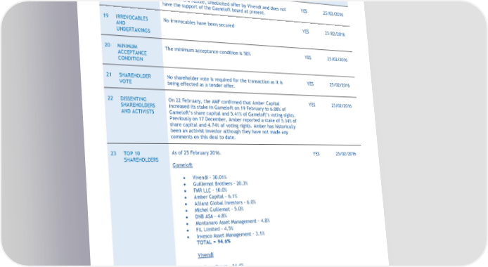 MERGER ARBITRAGE 25 February 2016 III. SHAREHOLDERS AND ACCEPTANCE DESCRIPTION COMMENTS COMPLETED LAST UPDATED 18 RECOMMENDATION The offer is a hostile, unsolicited offer by Vivendi and does not YES 25/02/2016 have the support of the Gameloft board at present. 19 IRREVOCABLES No irrevocables have been secured YES 25/02/2016 AND UNDERTAKINGS 20 MINIMUM The minimum acceptance condition is 50% YES 25/02/2016 ACCEPTANCE CONDITION 21 SHAREHOLDER No shareholder vote is required for the transaction as it is YES 25/02/2016 VOTE being effected as a tender offer. 22 DISSENTING On 22 February, the AMF confirmed that Amber Capital YES 25/02/2016 SHAREHOLDERS increased its stake in Gameloft on 19 February to 6.08% of AND ACTIVISTS Gameloft’s share capital and 5.41% of Gameloft’s voting rights. Previously on 17 December, Amber reported a stake of 5.34% of share capital and 4.74% of voting rights. Amber has historically been an activist investor although they have not made any comments on this deal to date. 23 TOP 10 As of 25 February 2016. YES 25/02/2016 SHAREHOLDERS Gameloft Vivendi – 30.01% Guillemot Brothers – 20.3% FMR LLC – 10.0% Amber Capital – 6.1% Allianz Global Investors – 6.0% Michel Guillemot – 5.0% DNB ASA – 4.8% Montanaro Asset Management – 4.8% FIL Limited – 4.5% Invesco Asset Management – 3.1% TOTAL = 94.6% Vivendi Bollore Group – 14.4% Blackrock – 4.8% Caisse des Depots et Consignations – 3.4% Amundi – 3.0% Baupost Group – 2.9% State Street – 2.2% Newton – 2.0% Southeastern Asset Management – 2.0% Norges Bank – 2.0% Vanguard Group 1.9% TOTAL = 38.6% 11 | P a g e