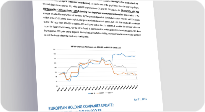 MAKOR FLASH-LIGHT Aug 12, 2015 March 2, 2016 EUROPEAN HOLDING COMPANIES UPDATE: Long MF FP/Short BVI FP+SGO FP Shares of Wendel (MF: FP) are trading at a 31% discount to current NAV (based on March 1 closing prices), up from December low of 22%. As can be seen in the graph below this is the highest level of the past two years trading history. Looking at a larger time interval of the past 5 years, the highest level was approx. 40% and was observed during the European financial crisis in mid-2012. The bearish sentiment in global equity markets over the past two months has led to widening of the discounts across almost all holding companies with Wendel being more aggressively impacted (currently it has one of the highest discounts among major European companies), on the back of two main factors: First, Wendel has a higher leverage compared with other holding companies (such as RF: FP and GBLB: BB that have cash balance and lower debt), and current LTV is approx. 36%. Second, following €2b investments over the past three years the portion of the unlisted portfolio has risen significantly and is now 40% of the total gross assets (compared with only 10% in 2012). Naturally, with the bearish sentiment, the market doesn’t favor these two factors leading to the significant widening of the discount. This creates, to our view, a good opportunity to steadily start built a position in on one of France’s main industrial holding companies that has been outperforming the CAC over time. Wendel historic discount to NAV and NAV per share over the past 5 years: What to expect in 2016 - Wendel’s management held an investor day in early December and discussed its strategy for 2016 which will be to focus on current portfolio value creation. Though management didn’t roll out possible new investments in a broadened investment scope, we don’t expect a significant new acquisition in 2016, at least not without disposals (especially given large acquisitions made over the past year). Management is expected to present the market a new strategy only in late 2016 as the goals of the previous plan have been reached two years ahead of schedule. Makor Securities Makor Capital Makor Capital Markets Makor Securities London Ltd Rogovin Tower Makor Securities London Ltd Makor Securities London Ltd 7/8 Savile Row 2nd Floor Menachem Begin 11 (Geneva Rep Office) (Paris Rep. Office) London W1S 3PE, ENGLAND 52689 Ramat Gan, ISRAEL 27 rue de la Croix-d’Or 51 rue Francois Premier +44 207 290 5777 +972 3 545 3777 1204 Geneve, SWITZERLAND 75008 Paris, FRANCE +41 223 106 916 +33 1 42 99 69 41 4
