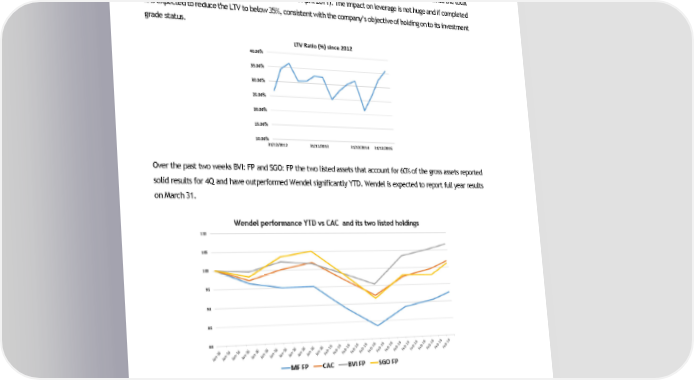 MAKOR FLASH-LIGHT Aug 12, 2015 Parcours potential disposal - On February 17 the company announced that ALD Automotive (Société Générale group) had offered to acquire all of Parcours (car leasing) shares for an equity value of €300 million. For Wendel the net proceeds of the transaction would total around €250 million. This amount would represent around 2.2 times the total amount Wendel has invested (IRR of c. 18% p.a. since April 2011). The impact on leverage is not huge and if completed it is expected to reduce the LTV to below 35%, consistent with the company’s objective of holding on to its investment grade status. Over the past two weeks BVI: FP and SGO: FP the two listed assets that account for 60% of the gross assets reported solid results for 4Q and have outperformed Wendel significantly YTD. Wendel is expected to report full year results on March 31. Valuation - Looking at current valuation of Wendel (€4.3B) – approx. 75% of its market cap reflects the value of the stake (44%) in BVI: FP (̴€3.2b) meaning the stub value (Wendel market cap- BVI: FP market cap) is valued by the market at approx. €950 million. This value is assigned to: 1) The 11.7% stake in SGO: FP - currently worth €2.3b (based Makor Securities Makor Capital Makor Capital Markets Makor Securities London Ltd Rogovin Tower Makor Securities London Ltd Makor Securities London Ltd 7/8 Savile Row 2nd Floor Menachem Begin 11 (Geneva Rep Office) (Paris Rep. Office) London W1S 3PE, ENGLAND 52689 Ramat Gan, ISRAEL 27 rue de la Croix-d’Or 51 rue Francois Premier +44 207 290 5777 +972 3 545 3777 1204 Geneve, SWITZERLAND 75008 Paris, FRANCE +41 223 106 916 +33 1 42 99 69 41 5