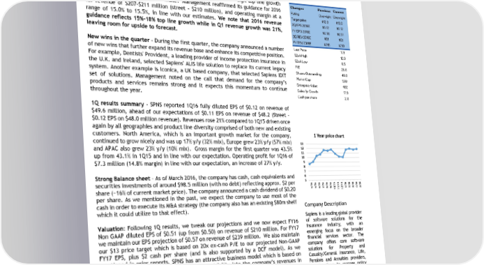 Makor Securities Makor Securities London Ltd (Paris Rep. Office) 336 rue Saint Honore 75001 Paris, FRANCE +33 1 42 33 02 05 Makor Capital Markets Makor Securities London Ltd (Geneva Rep Office) 27 rue de la Croix-d’Or 1204 Geneve, SWITERLAND +41 223 106 916 Makor Capital Rogovin Tower Menachem Begin 11 52689 Ramat Gan, ISRAEL +972 3 545 3777 Makor Securities London Ltd 7/8 Savile Row 2nd Floor London W1S 3PE, ENGLAND +44 207 290 5777 ISRAELI TECH SAPIENS INTERNATIONAL CORPORATION N.V. (NASDAQ:SPNS) May 13, 2016 Sapiens International Corporation (SPNS: US) 1Q results – Solid start to the year; Maintaining overweight and $13 Price Target Sapiens (SPNS: US) posted a solid start to the year with double digit top line growth that beat the street and our estimate. Management reaffirmed its guidance for 2016 for revenue of $207-$211 million (street - $210 million), and operating margin at a range of 15.0% to 15.5%, in line with our estimates. We note that 2016 revenue guidance reflects 15%-18% top line growth while in Q1 revenue growth was 21%, leaving room for upside to forecast. New wins in the quarter - During the first quarter, the company announced a number of new wins that further expand its revenue base and enhance its competitive position. For example, Dentists' Provident, a leading provider of income protection insurance in the U.K. and Ireland, selected Sapiens' ALIS life solution to replace its current legacy system. Another example is Iconica, a UK based company, that selected Sapiens IDIT set of solutions. Management noted on the call that demand for the company’s products and services remains strong and it expects this momentum to continue throughout the year. 1Q results summary - SPNS reported 1Q16 fully diluted EPS of $0.12 on revenue of $49.6 million, ahead of our expectations of $0.11 EPS on revenue of $48.2 (Street - $0.12 EPS on $48.0 million revenue). Revenues rose 21% compared to 1Q15 driven once again by all geographies and product line diversity comprised of both new and existing customers. North America, which is an important growth market for the company, continued to grow nicely and was up 17% y/y (32% mix), Europe grew 23% y/y (57% mix) and APAC also grew 23% y/y (10% mix). Gross margin for the first quarter was 43.5% up from 43.1% in 1Q15 and in line with our expectation. Operating profit for 1Q16 of $7.3 million (14.8% margin) in line with our expectation, an increase of 27% y/y. Strong Balance sheet – As of March 2016, the company has cash, cash equivalents and securities investments of around $98.5 million (with no debt) reflecting approx. $2 per share (~16% of current market price). The company announced a cash dividend of $0.20 per share. As we mentioned in the past, we expect the company to use most of the cash in order to execute its M&A strategy (the company also has an existing $80m shelf which it could utilize to that effect). Valuation: Following 1Q results, we tweak our projections and we now expect FY16 Non GAAP diluted EPS of $0.51 (up from $0.50) on revenue of $210 million. For FY17 we maintain our EPS projection of $0.57 on revenue of $239 million. We also maintain our $13 price target which is based on 20x ex-cash P/E to our projected Non-GAAP FY17 EPS, plus $2 cash per share (and is also supported by a DCF model). As we mentioned in prior reports, SPNS has an attractive business model which is based on long engagement cycle thus creates strong visibility into the company’s revenues in the short and long term. The company has demonstrated strong execution over that last quarters, which we believe will continue in 2016. An M&A deal could also be a catalyst. We maintain our overweight rating. Company Description Sapiens is a leading global provider of software solutions for the insurance industry, with an emerging focus on the broader financial services sector. The company offers core software solutions for Property and Casualty/General Insurance, Life, Pensions and Annuities providers, allowing them to manage policy administration, claims management and billing functions. 5 6 7 8 9 10 11 12 13 4/155/156/157/158/159/1510/1511/1512/151/162/163/164/165/16 1 Year price chart